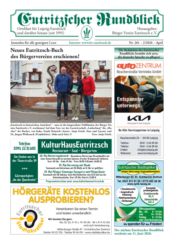 Seit 1991 engagieren sich bei uns Bürgerinnen und Bürger im Rahmen einer aktiven Nachbarschaft für ein lebenswertes Eutritzsch und darüber hinaus. Wir sind dabei u. a. Herausgeber des Eutritzscher Rundblicks, führen regelmäßig Veranstaltungen zum Stadtteil durch und pflegen die lokale Historie.